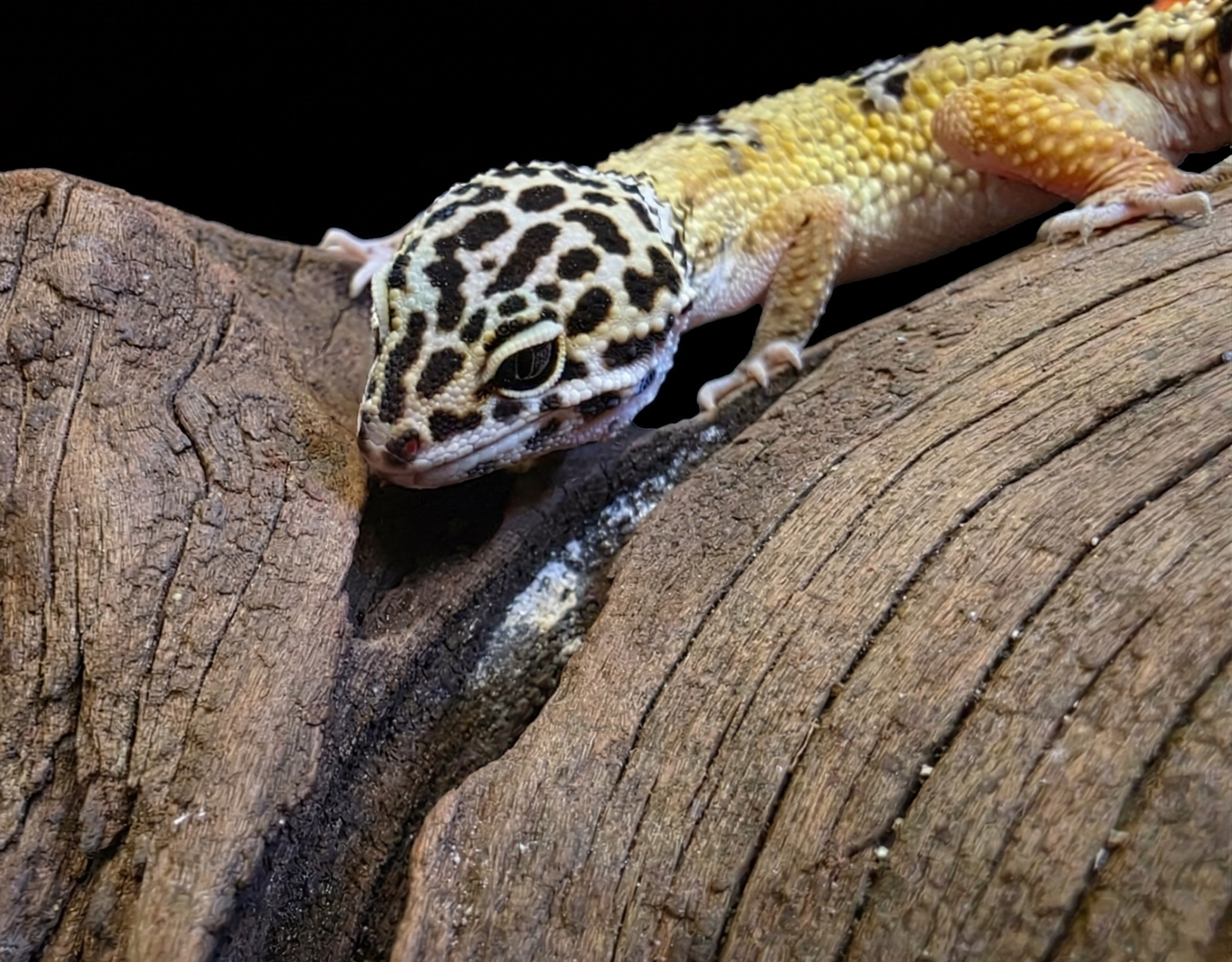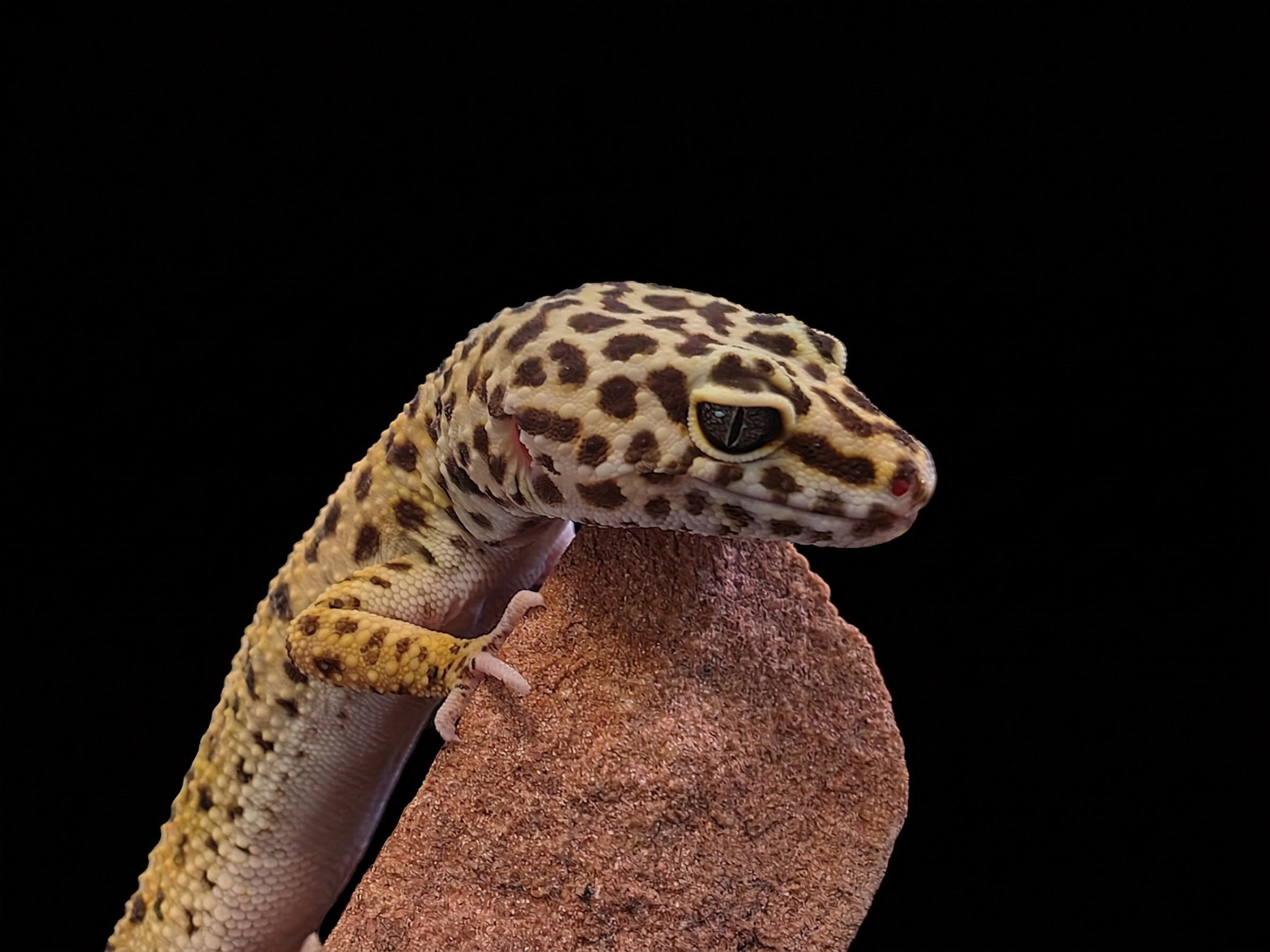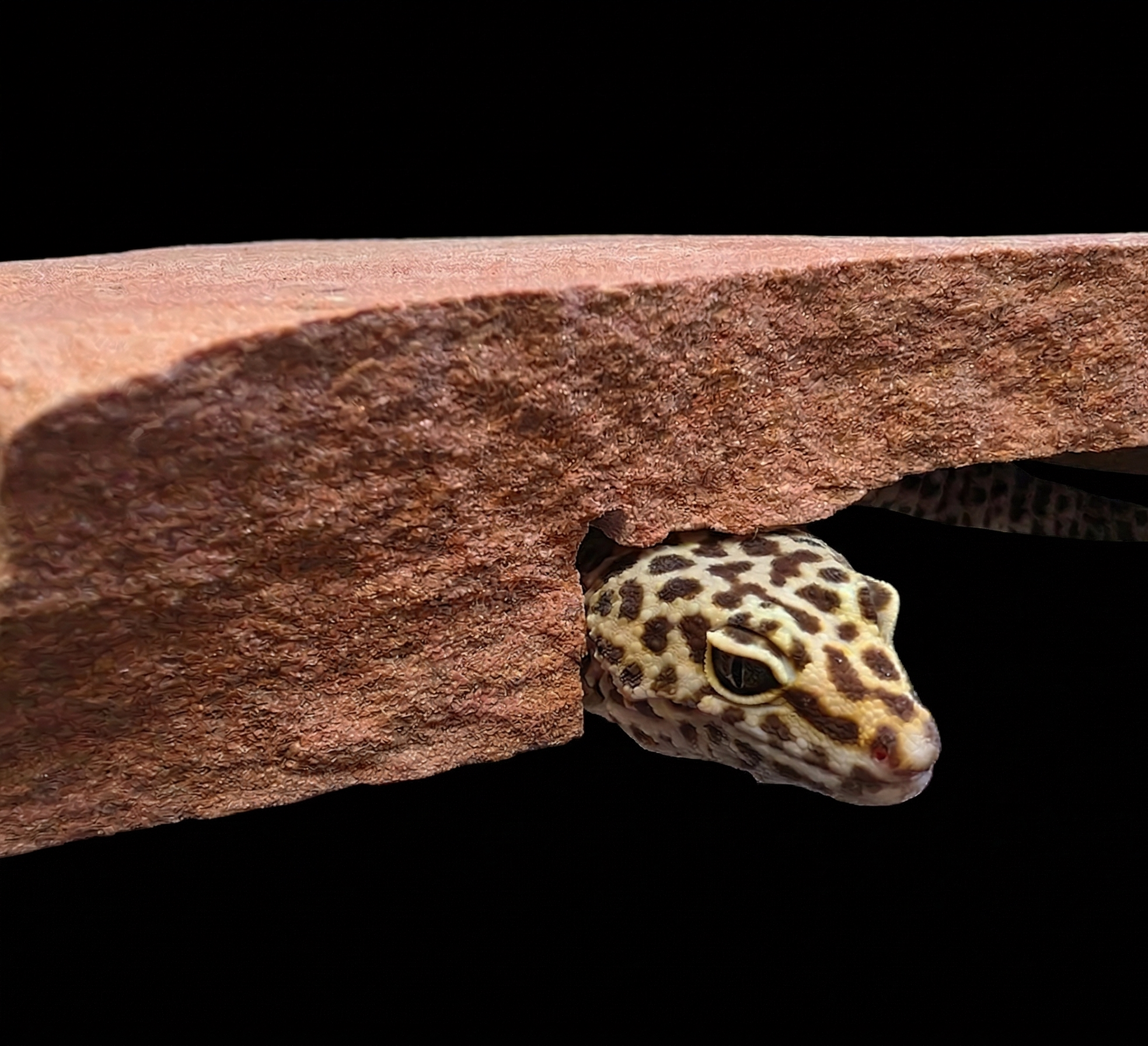 Temperature: You must provide a temperature gradient. The warm side basking surface should reach between 90-95°F (32-35°C). Leopard geckos rely heavily on belly heat to properly digest their meals, which is why we highly recommend using our Custom Natural Stone Caves as their primary warm hide. The real rock efficiently absorbs overhead warmth and radiates heat up to your gecko's belly while they rest inside or on top. The ambient temperature on the warm side should be around 85°F, fading down to a cool side of 70-75°F (21-24°C) so your gecko can thermoregulate.